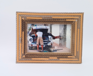 Cadre réalisé en carton d’emballage recyclé. Le cadre permet de recevoir une photo de 10 cm x 15 cm. Il peut être posé ou accroché, verticalement ou horizontalement.